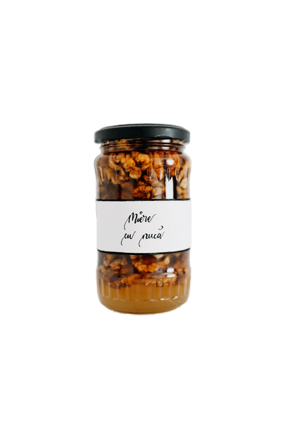 Conținut : miere de salcâm 300gr, sâmburi de nucă 100gr.